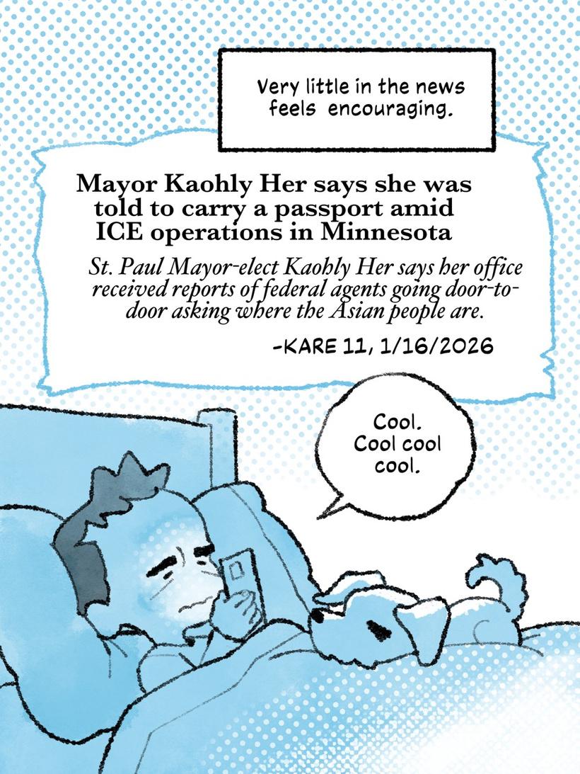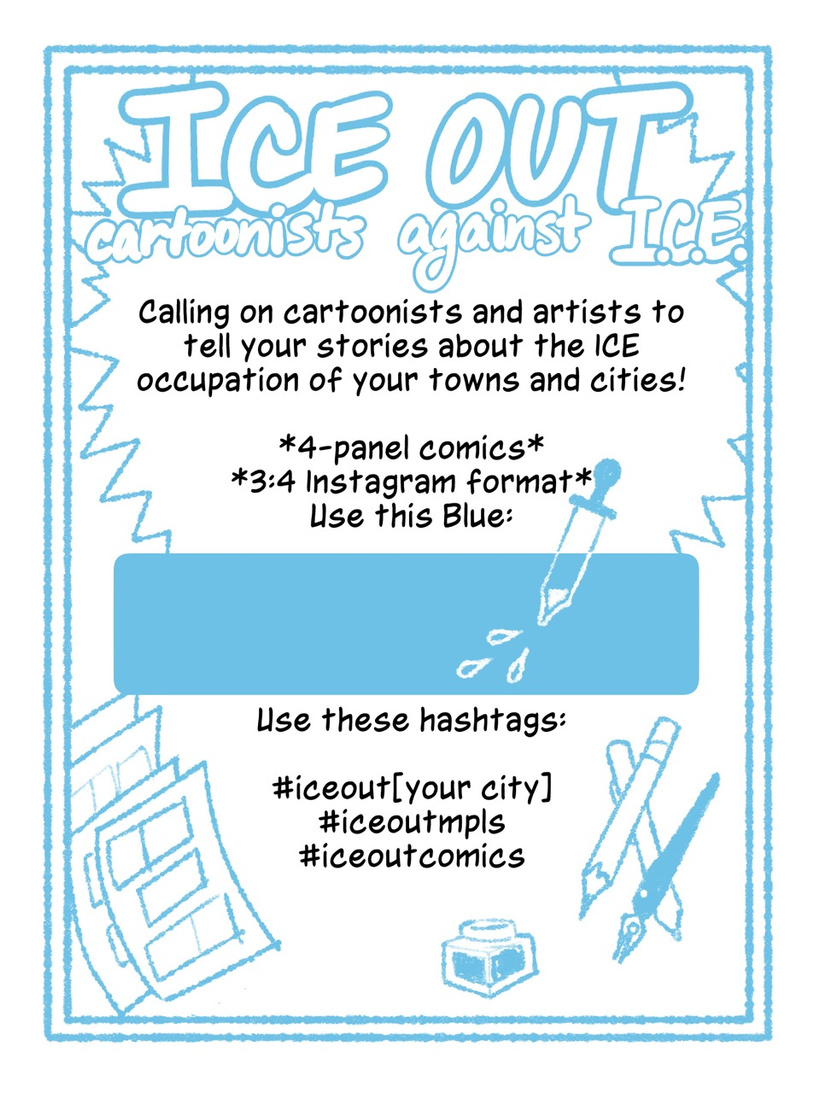 I’m going to give you the unsexy answer, which is that while I think art-making and participating in the culture is important, I’m currently more concerned about how I show up as a citizen and as a neighbor. I think art can be powerful and affecting, and in this case it serves an important record-keeping function. But I don’t think any of us are stopping at making art. A lot of us are showing up at our local community centers to connect with neighbors. Some of us are points of contact for friends who are more vulnerable to ICE’s racial profiling. We’re participating in mutual aid efforts like clothing drives and food shelves for families impacted by ICE abductions, school closures, or for families with breadwinners afraid to leave their homes.
